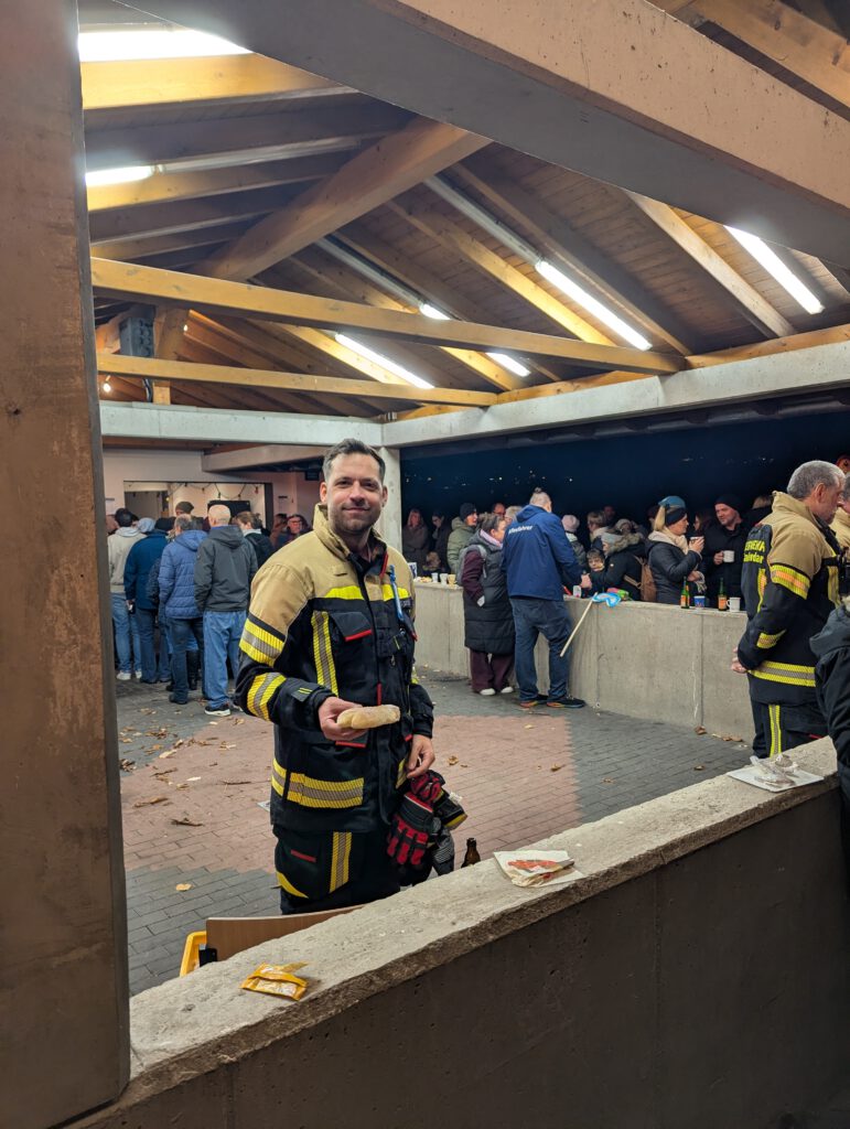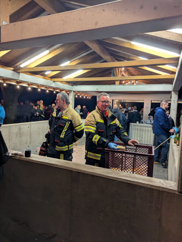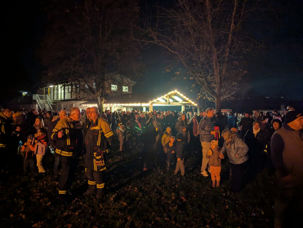 Nachdem sich der Umzug durch das Dorf geschlängelt hatte, näherte sich dieser dem Schützenplatz. Auf dem Schützenplatz angekommen, warteten dort bereits die leckeren Martinswecken. Am Imbissgebäude des Schützenvereins wurden diese durch die Kameraden der Feuerwehr an die fröhlichen Kinder verteilt, sodass alle noch einige gemütliche Stunden rund um das wärmende Martinsfeuer verbringen konnten. Die Kameraden der Feuerwehr behielten das Feuer im Auge, bis es heruntergebrannt war.